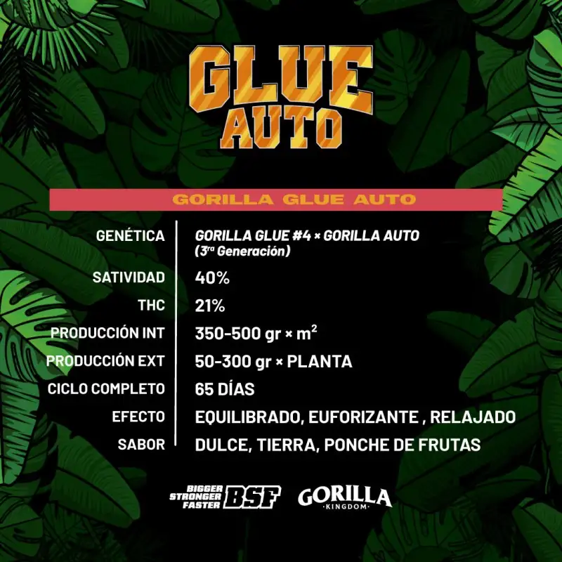 - Gorilla Glue Auto es resultado del cruce de nuestro clon autofloreciente de tercera generación con un clon élite Gorilla Glue #4, obteniendo una planta de estatura media y fácil cultivo.