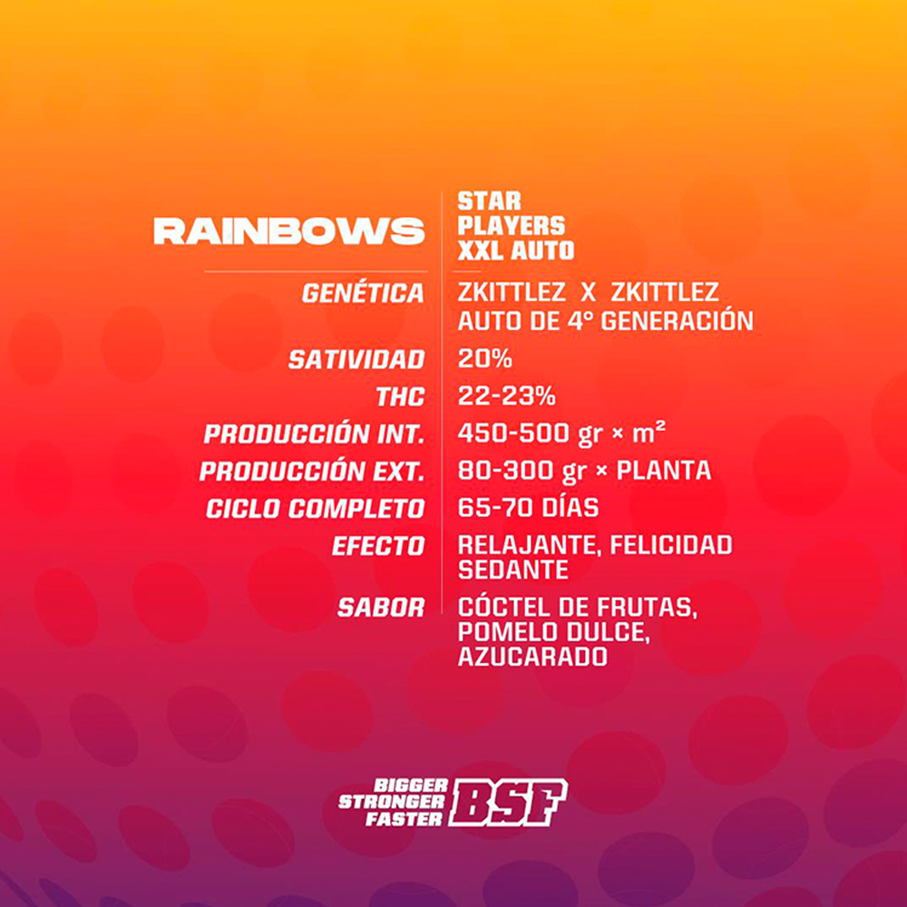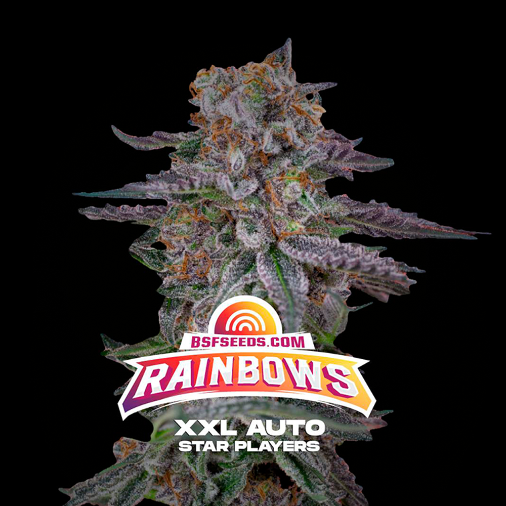 - Rainbows XXL Auto fue desarrollada durante cinco años y cruzada por cuatro generaciones hasta conseguir la estabilidad, los terpenos, la producción necesaria para conseguir la versión autofloreciente de la campeona de BSF Seeds Rainbows Fem.